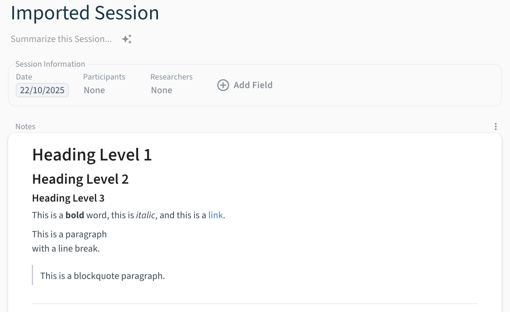 The /sessions endpoint can be used to import raw data directly into a Condens session, including Information Fields, notes and media recordings. View the guide on Information Fields to learn more about creating and modifying Information Fields. This guide focuses on importing notes and media recordings.